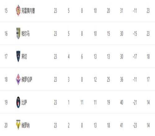 保级区方面,克雷莫内塞和帕尔马同积23分,均领先降级区6分,形势相对安全;而莱切输球后积18分,仅仅只比降级区多1分。
