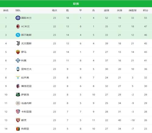 国际米兰55分稳居榜首,领先优势扩大到8分;尤文45分位列第一集团;那不勒斯排名第3,但已落后国米9分,追赶难度不小。