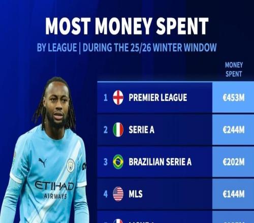 德转列2026年冬窗联赛支出榜:英超4.53亿欧断档第1,意甲第2