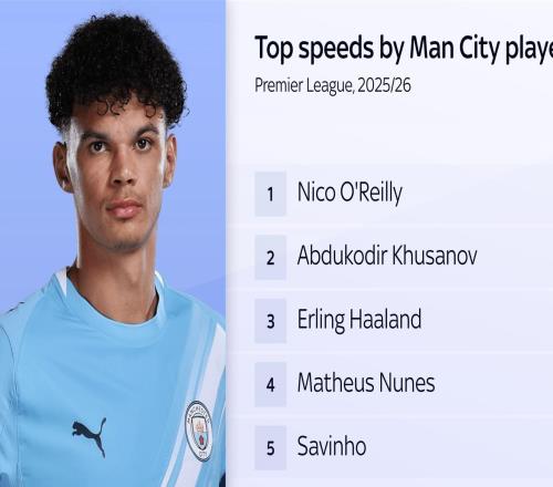 时速35.98km,奥赖利创造曼城本赛季最快冲刺速度 -